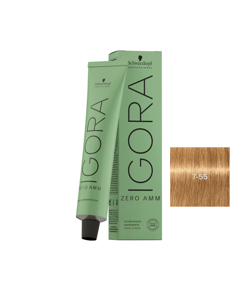 Η IGORA ZERO AMM 7-55 Ξανθό Μεσαίο Έντονο Χρυσό, είναι μια μόνιμη κρέμα βαφής μαλλιών, 100% χωρίς αμμωνία που μπορεί να χρησιμοποιηθεί με όλες τις τεχνικές χρώματος, χωρίς συμβιβασμούς! Η σύνθεση χωρίς αμμωνίας με την Τεχνολογία Phytolipid περιέχει βελτιστοποιημένες μίξεις πιγμέντων και ένα μίγμα φυσικών μικρομορίων, βοηθούν στην βελτίωση της χρωματικής απόδοσης για αξιόπιστα χρωματικά αποτελέσματα μεγαλύτερης διάρκειας χωρίς οσμές αμμωνίας.